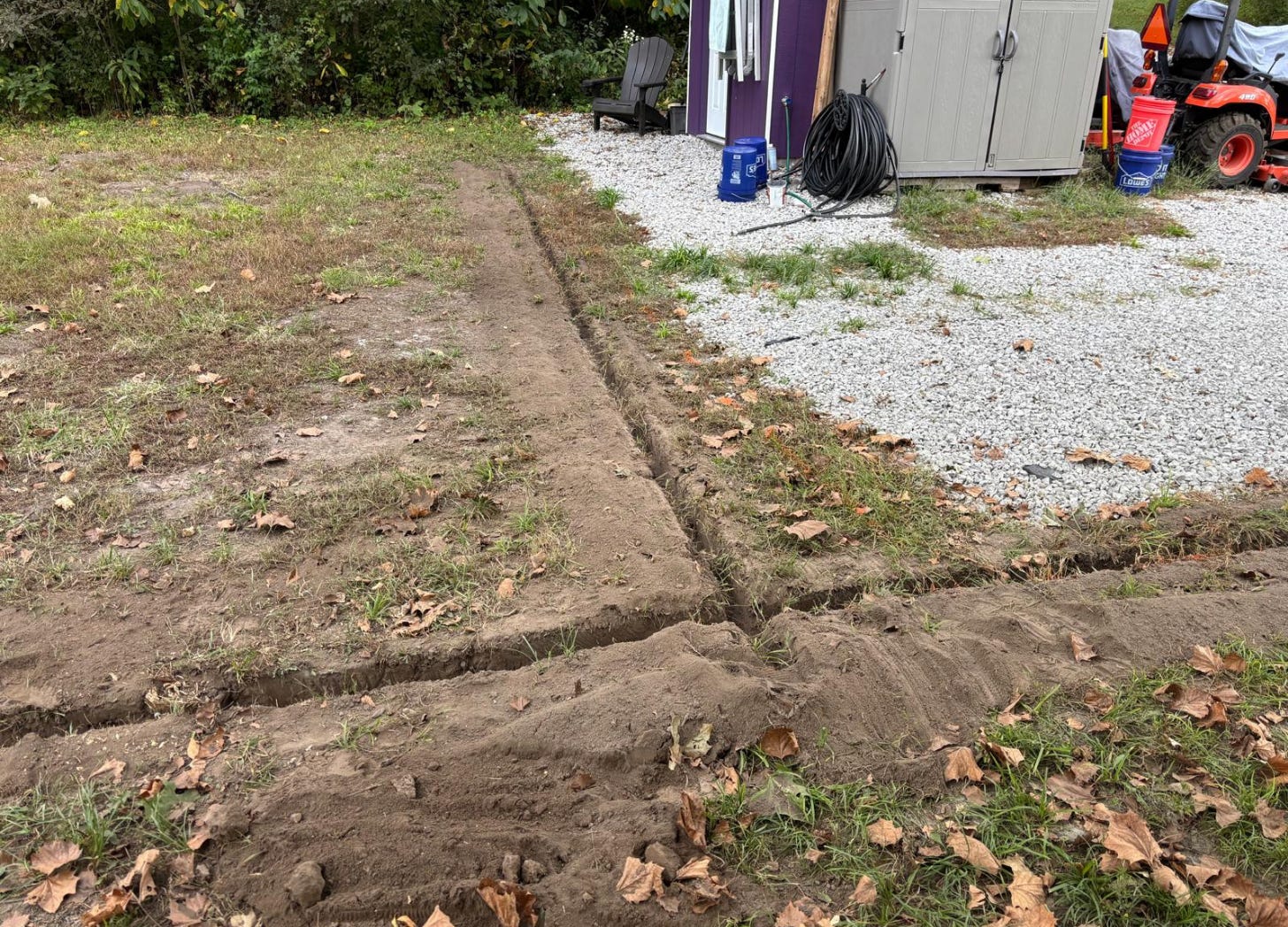 We rented a 13” landscape trencher, and wow… it was a beast. Uncontrollable & dangerous, actually. The machine would take off on its own, cutting a chaotic path, and neither of us could safely reach the off switch while it was bucking around. For a bit we thought we’d have to return it.