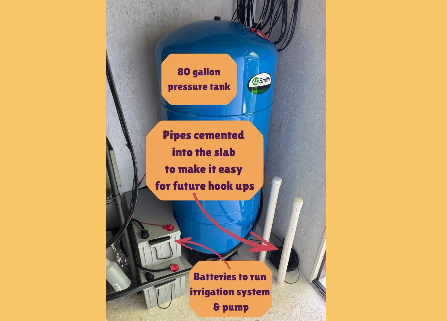 The irrigation design calls for 10-18 gallons per minute, but our well only produces 4 gpm. To buffer the system, Ben installed an 80-gallon pressure tank and made a key adjustment to the design. On the east side of the larger elderberry field, he plans to tie the system into our 1,000-gallon bathhouse water tank. Since the tank sits 25–30 feet uphill, it will function like a gravity-fed water tower, naturally boosting water pressure across the system.