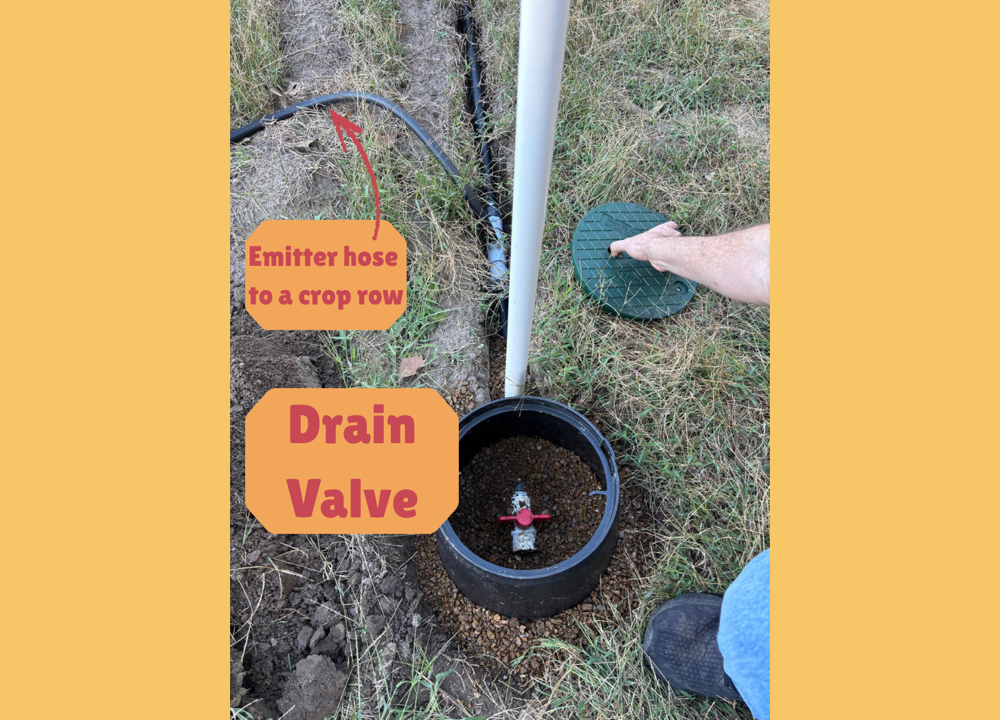 After the trenching ordeal, neither of us had the energy for more digging. So we accepted a compromise: the drain valves are not on grade - they stick up a few inches. They’re located next to the vertical PVC vent pipes, and we added t-posts around them to prevent accidental damage during field work.